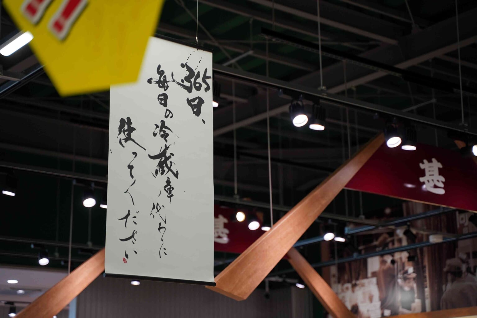 2020年9月にオープンした「舟入南店」の店内では、エブリイが大切にしている「商人魂」という想い、店内各コーナーの屋号を、翠蘭氏が魂込めて書いてくださりました。力強い字で、店内各コーナーにエネルギーを吹き込んでくださっています。