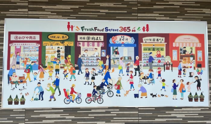 広島県を拠点に活動中の絵本作家「さこももみ」先生が描くエブリイの「fresh food street(商店街)」