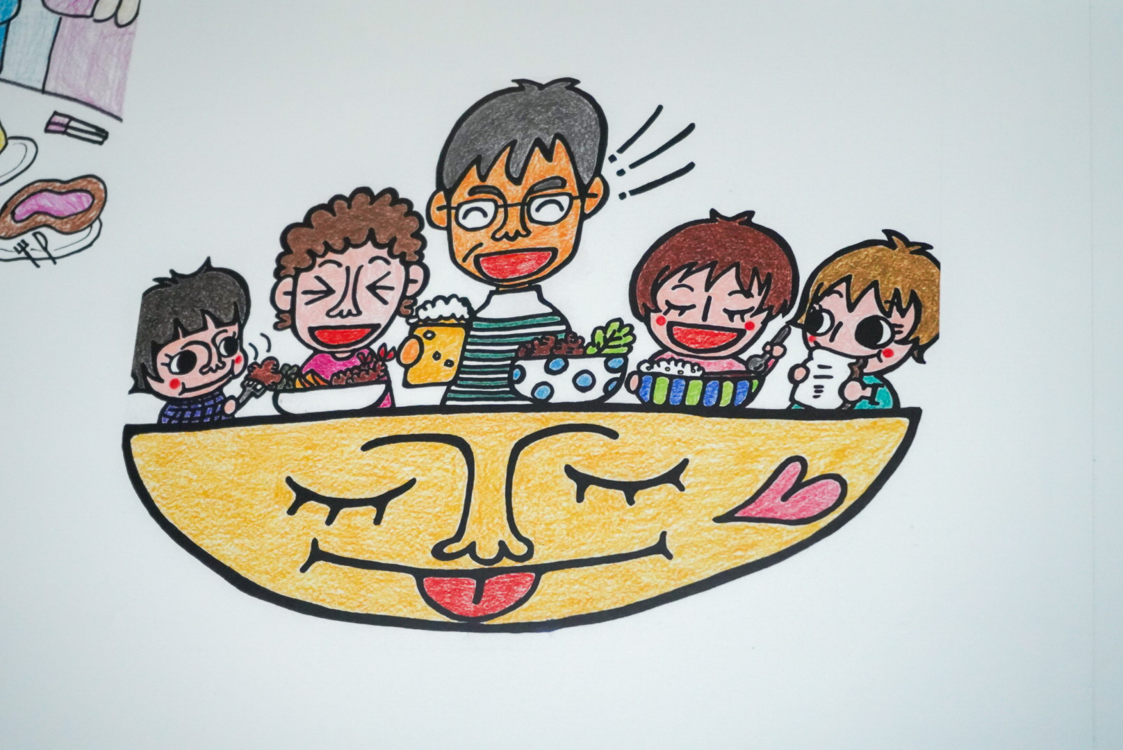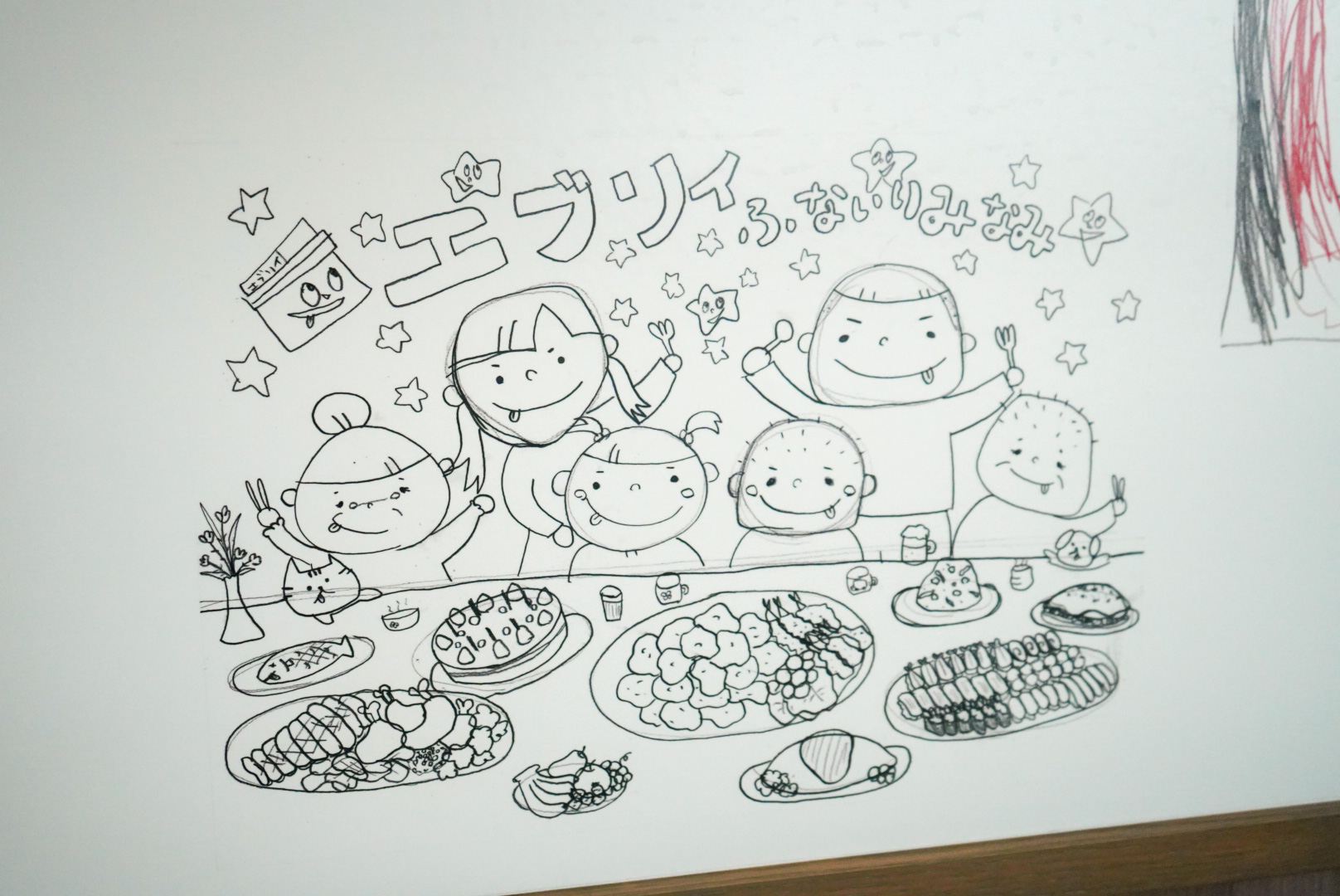 この白い壁を広島在住の書道家翠蘭先生と地域の子ども達の「笑顔の食卓」のイラストでいっぱいにしよう!と企画を立ち上げました。