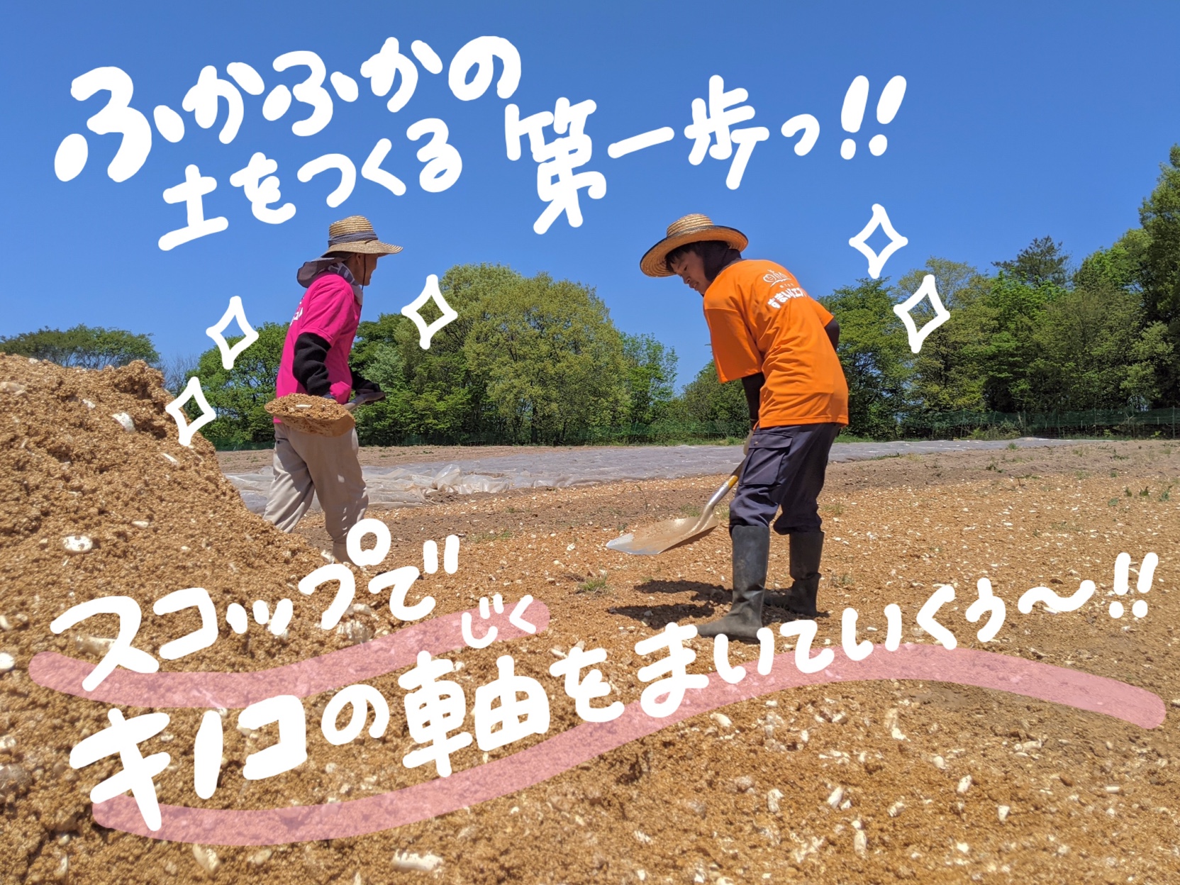 スコップでキノコの軸をまきます!これが、ふかふかの土をつくる第1歩!
