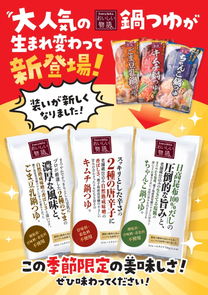 毎年ご好評いただいている「おいしい物語 素材の旨さ引き立つ鍋つゆ」が、この度、パッケージを一新して装い新たに登場します!