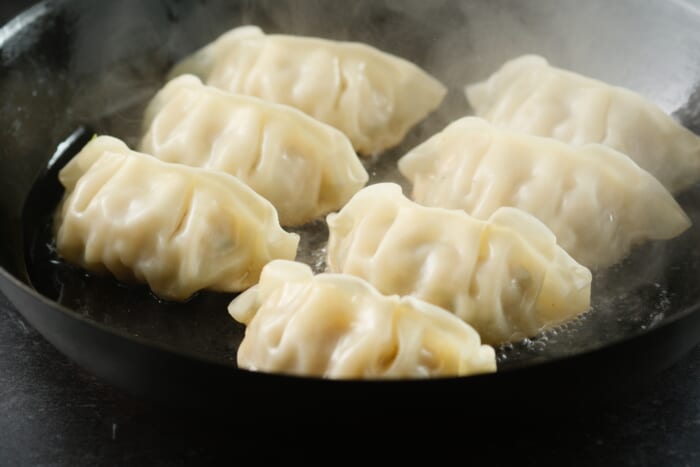 1.熱したフライパンに油(大さじ1)をひき、凍ったままの餃子を並べる。