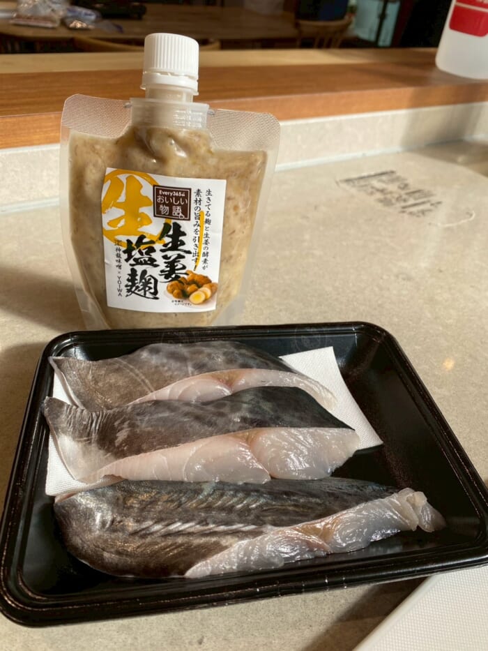 ① ポリ袋に白身魚・生姜塩麴を入れて1時間漬ける