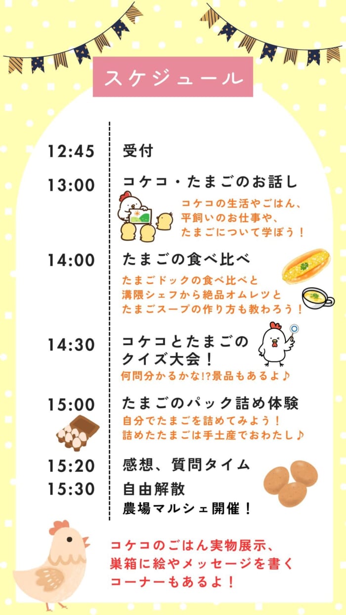 今回は、感謝イベントとして「コケコたちはどんな生活をしているの?」「どんなごはんを食べているの?」など、コケコやたまごについて、見て・知って・食べて・感じる内容になります。