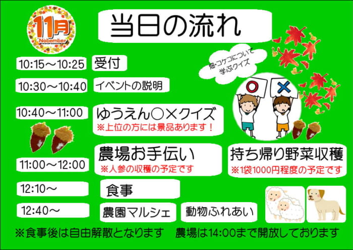 今回は、皆で参加できる農園クイズ大会・収穫期を迎える人参の収穫のお手伝い体験・持ち帰り野菜の収穫・炭火焼焼芋や農場野菜をメインにつかったポトフをご用意してお待ちしております!