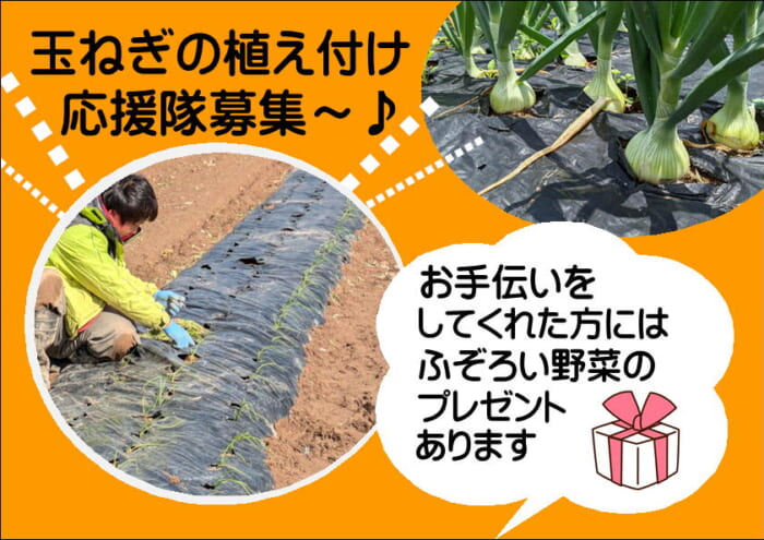 玉ねぎの植え付けをお手伝いしてくださった方々にはふぞろい野菜を少しプレゼント致します!ぜひ皆様お手伝いもして帰ってくださいませ